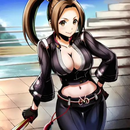 • 动漫风格触发词:MaiCOTWAnime, 1girl, 大胸, 高马尾, shiranui mai, 长发, 露脐, 无指手套, 棕发, 肚脐, 裤子, 乳沟, 棕眼, 腰带, 西部镜头