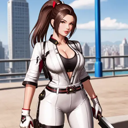 • 触发词:MaiCOTW, 1girl, 大胸, 高马尾, 手套, 露脐, 肚脐, 棕发, 裤子, 腰带, 拉链, 乳沟, 项圈, shiranui mai, 长发, 短夹克, 嘴唇, 棕眼, 牛仔布, 皮革