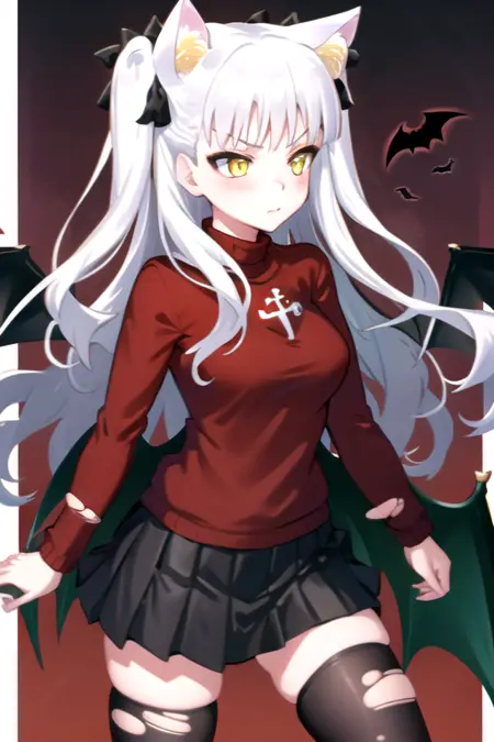 GremRin, 1girl, solo, long hair, black skirt, black thighhighs, cat ears, medium breasts, white hair, yellow eyes, bat wings, two side up, red sweater, turtleneck, kemonomimi mode, torn thighhighs, tohsaka rin