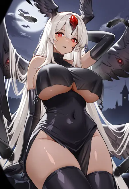 Halloween costume: SaoMartinhohalloween, black dress, black elbow gloves, black thighhighs, breast curtain, underboob, facial marking, wings, black feathered wings,
