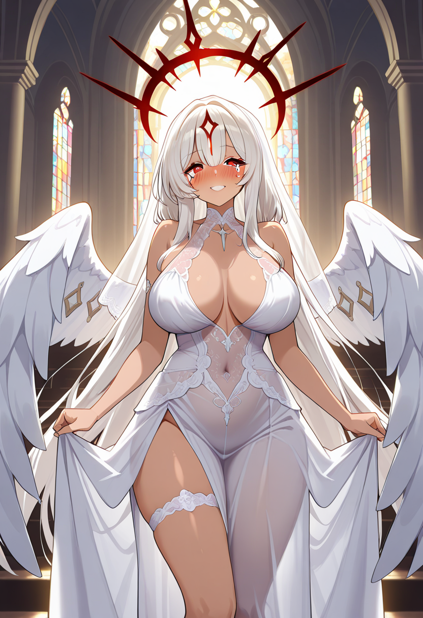 Default costume: SaoMartinhoDefault, white dress, navel, breast curtain, facial marking, halo, wings, angel wings,