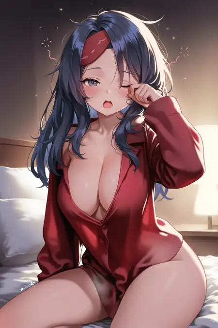 졸린 미타 \(miside\), 1소녀, 유방, 가슴선, 큰 가슴, 빨간 반바지, 반바지, 혼자, 초커, 긴 머리, 파란 초커, 셔츠, 줄무늬 옷, 어지러운 머리, 긴 소매,