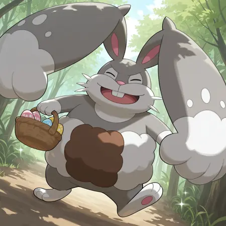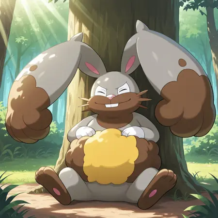 标签: pokemon(生物)、兔子、门牙、白色眼白、闭眼、灰色身体、毛茸茸、腰部棕色和黄色毛发、棕色口鼻、多色毛发、粉红色鼻子、棕色脖子、棕色胡须、大耳朵、粉红色耳内、三趾、三指、棕色脚、灰棕色耳朵