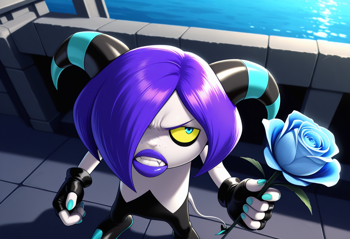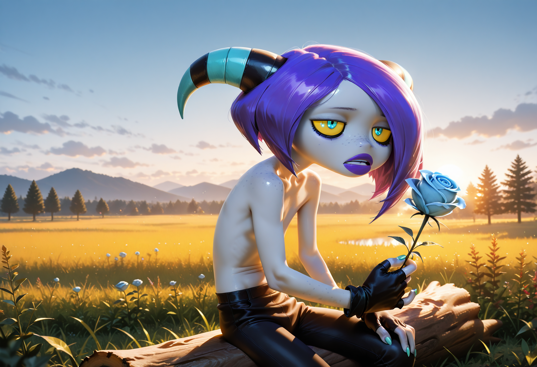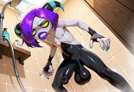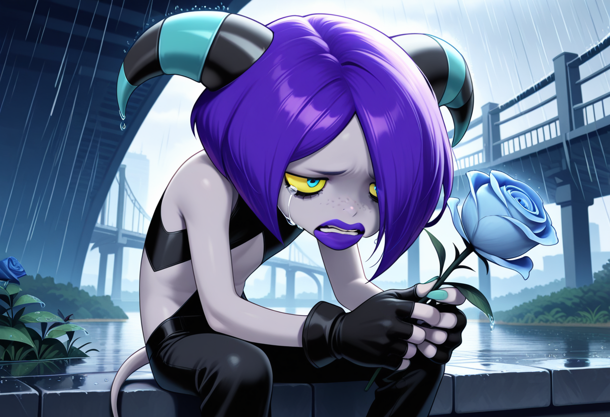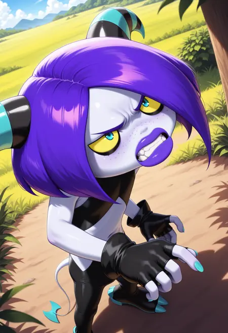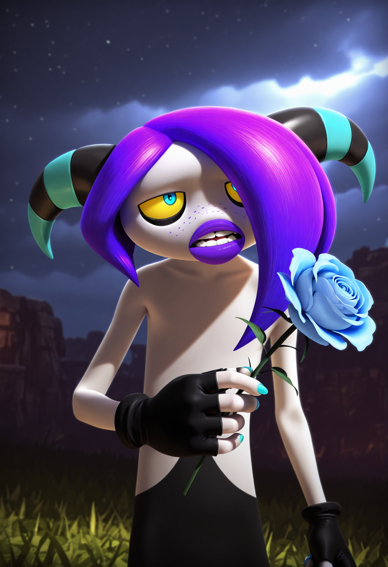 태그(우이): 노란 공막, 손가락 없는 장갑, 이색 피부, 제티, 곡선 모양의 뿔, 보라색 입술, 파란 눈, 보라색 머리카락, 주근깨, 청록색 손톱, 꼬리(선택사항), 한쪽 눈 위의 머리카락 [정확성을 위해]
