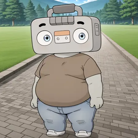 juke, male, 1boy, no humans, black eyebrows, grey skin, grey body, light blue eyes, young, plump, fat, chubby, short, flat face, boombox head, object head, mouthless, no mouth,
