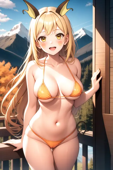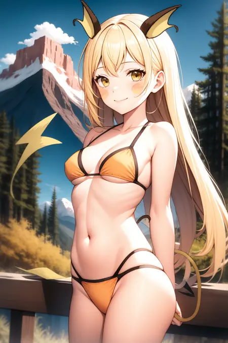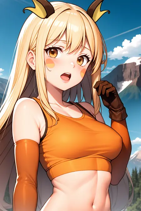 提示词:1girl, solo, long hair, skirt, blonde hair, large breasts, shirt, thighhighs, gloves, navel, bare shoulders, medium breasts, tail, yellow eyes, thighs, pleated skirt, outdoors, sky, sleeveless, day, elbow gloves, midriff, cloud, miniskirt, stomach, zettai ryouiki, crop top, sleeveless shirt, skindentation, facial mark, personification, brown skirt, mountain, taut clothes, brown thighhighs, orange shirt, taut shirt