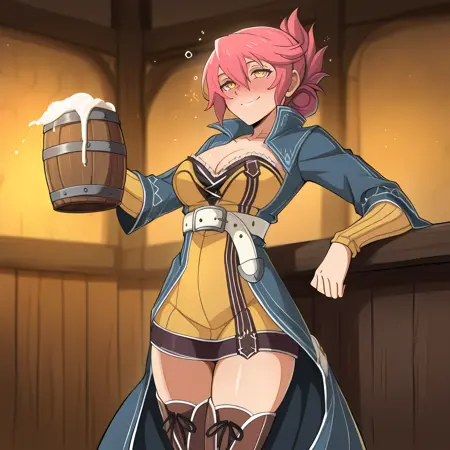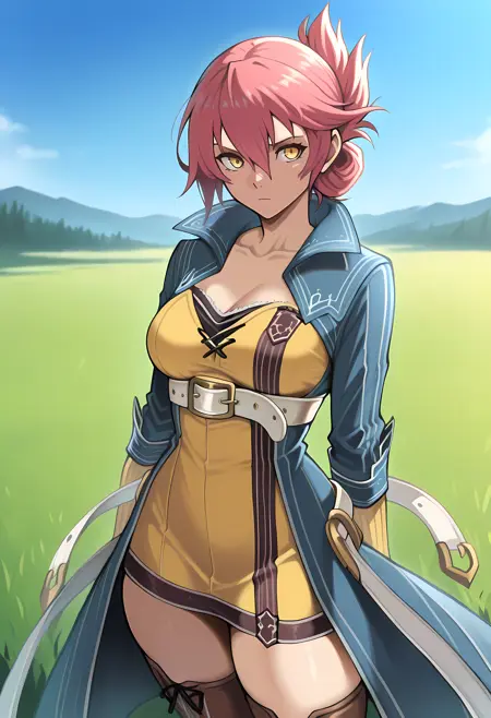 《空之轨迹》1+2:saravalestein_cs,蓝色外套,黄色连衣裙,扎起的马尾,白色腰带,大腿靴,绝对领域
