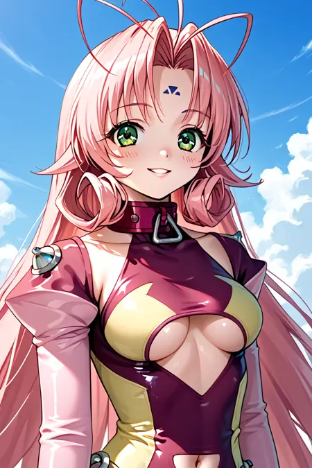 miu, 1girl, 单人, 长发, 乳房, 肚脐, 极长发, 中等乳房, 绿眼睛, 粉色头发, 领子, 衣物切口, 连体衣, 下胸缘, 面部标记, 天线发, 额头标记, 肚脐切口, 下胸缘切口, 长袖, 胸部切口, 面向观众, 多色连体衣,