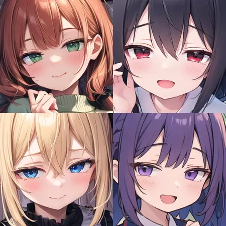 複数タイプを同時に適用したり、アイコレクション(HuggingFaceで公開中) と同時に適用することで眼の形をさらにカスタマイズすることもできます。この場合、それぞれのLoRAの強度は応分(2つなら0.5ずつにするなど)してください。