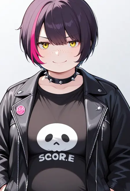 Hagtakky, yellow eyes, light eyes, dark purple hair, dark hair, pink hair, pink streaks, two-tone hair, colored inner hair, short hair, swept bangs, bangs, hair between eyes, freckles, plump,