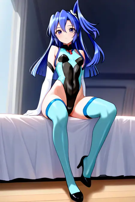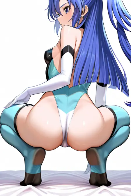 小胸, tsubasadef, ハイレグレオタード, 肘まで手袋, 白手袋, 青色の太ももまで丈のストッキング, スキンタイト