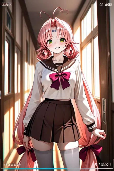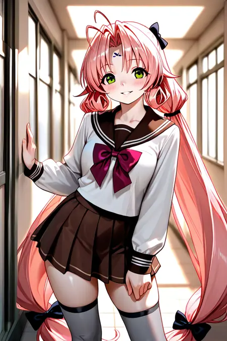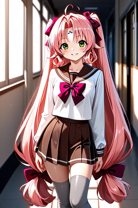 miu, 1girl, 长发, 裙子, 过膝袜, 蝴蝶结, 丝带, 极长发, 双马尾, 校服, 粉色头发, 发带, 发饰蝴蝶结, 百褶裙, serafuku, 绝对领域, 低扎长发, 白皙皮肤, 极度长发, 棕色裙子, 灰色过膝袜, 长袖