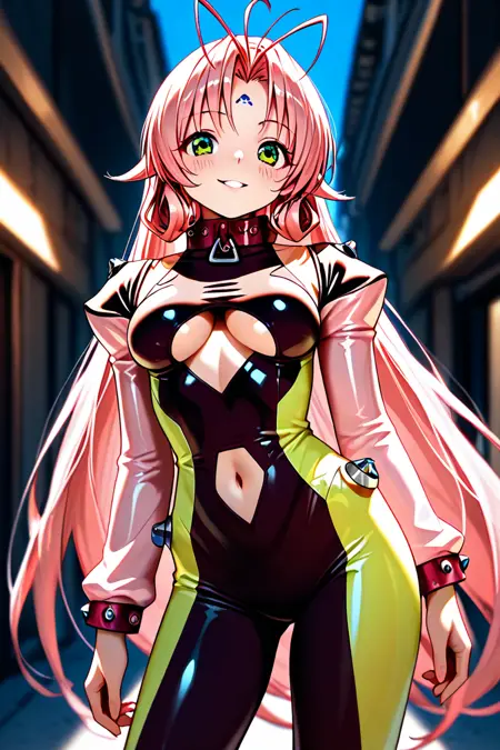 miu, 1girl, 单人, 长发, 乳房, 肚脐, 极长发, 中等乳房, 绿色眼睛, 粉色头发, 领子, 服装镂空, 连体衣, 下胸缘, 面部纹身, 天线发, 额头标记, 肚脐镂空, 下胸缘镂空, 长袖, 胸部镂空, 面向观众, 多色连体衣,