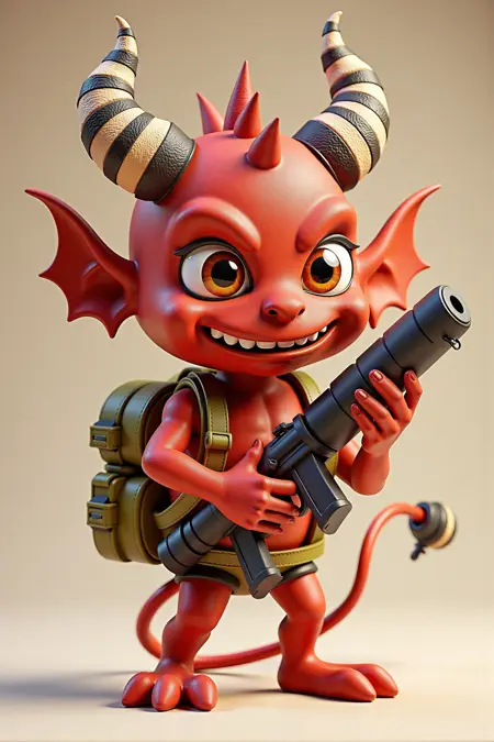 - "DwkT, 3D 卡通风格,一个小红魔鬼手持现代武器 RPG 火箭筒,露出邪恶表情"