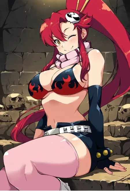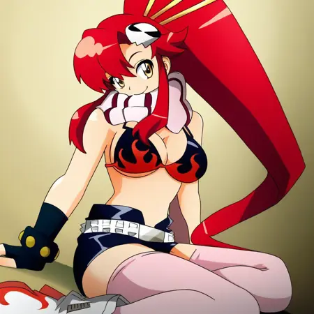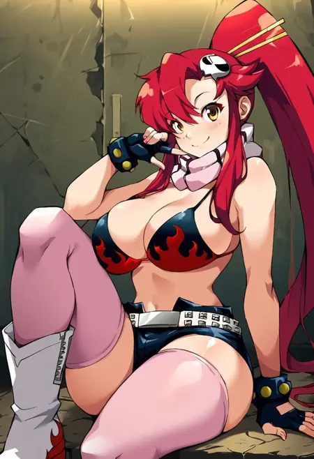 | Trained Words | Base: Yoko, long hair, red hair, high ponytail, side bangs, yellow eyes, large breasts,Copied! Outfit: hair ornament, skull hair accessory, flame bikini top, black shorts, white scarf, black fingerless gloves, thigh-high stockings, pink stockings, white boots, red flame details, Copied! |