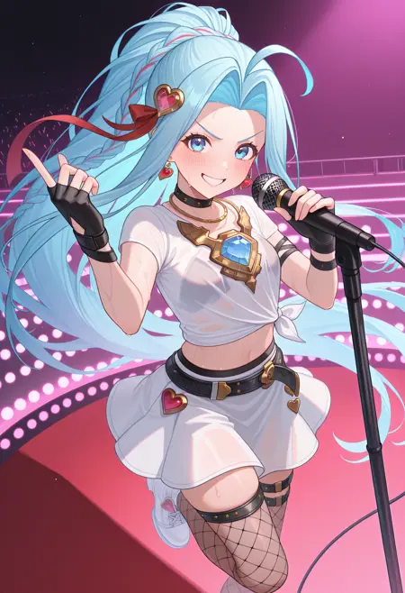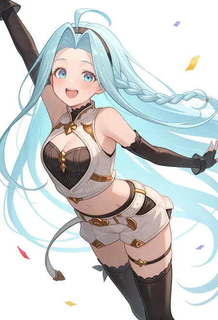 - lyr21fes, 옆머리 땋기, 머리띠, 이톤 베스트, 흰색 베스트, 소매 없음, 어깨 노출, 옷 절개, 가슴 절개, 팔꿈치 장갑, 검은 장갑, 손가락 없음 장갑, 허리, 흰색 반바지, 흰색 벨트, 검은 허벅지 스타킹, 허벅지 스트랩,
