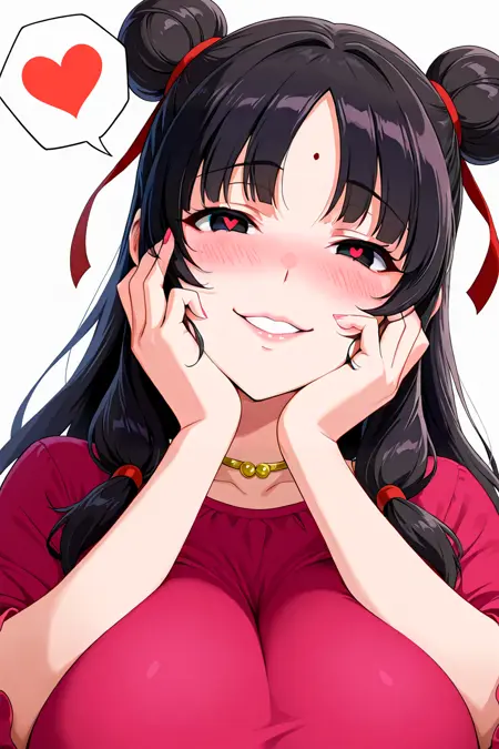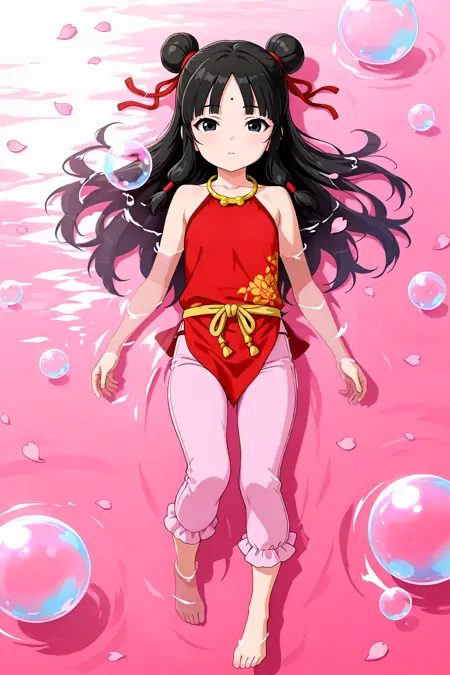 feng wa, long hair, black hair, black eyes, hair bun, double bun, forehead mark, gold choker, red dudou, pink pants