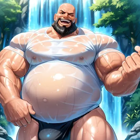 Recommended Prompts: black eyes, black hair, bald, medium hair, facial hair, beard, fat, big belly, white shirt, white pants, torn sleeves, black bracelets, barefoot