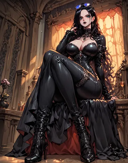 一个捕捉《海贼王》中妮可·罗宾的LoRA,采用鲜艳的动漫风格。时间跳跃后的妮可·罗宾,留着长长的黑发。非常适合生成标志性造型,如毛衣、紧身衣或传统裹裙,常搭配墨镜,眼神自信,背景简洁。