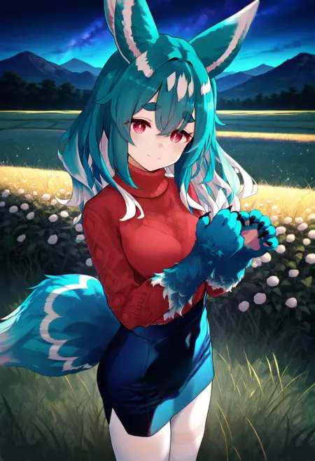 lenja, 狐耳, 狐尾, 动物耳朵绒毛, 耳夹, 蓝色头发, 浓眉, 红眼, 白色瞳孔, 动物手掌, 动物脚掌