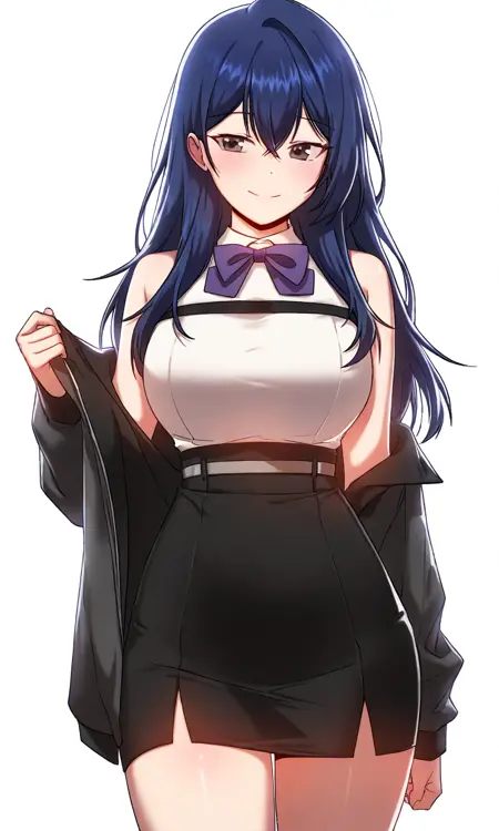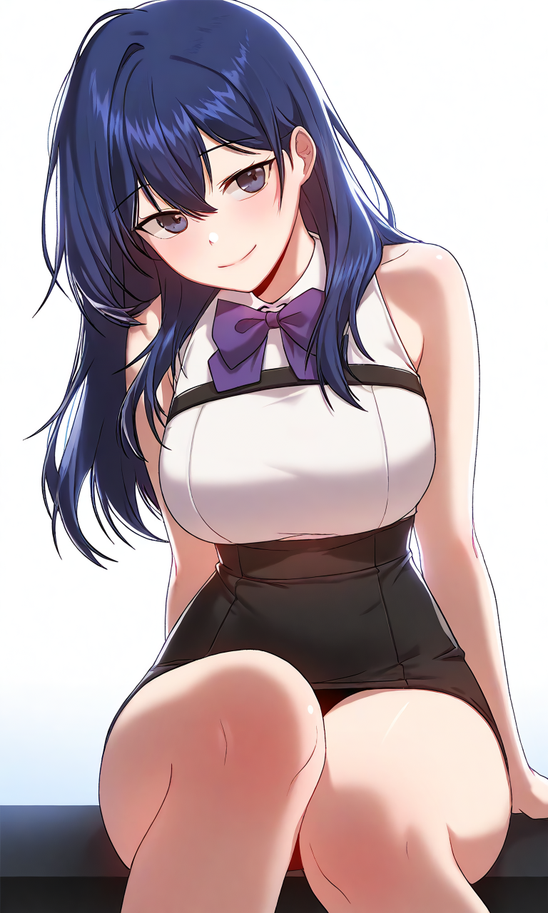 • nam daeun \(seka\), 蓝发, 裸露肩膀, 无袖, 发饰, 眼前头发, 紫色蝴蝶结, 紫色领结, 黑色裙子, 衬衫, 白色衬衫, 高腰裙, 长发, 铅笔裙