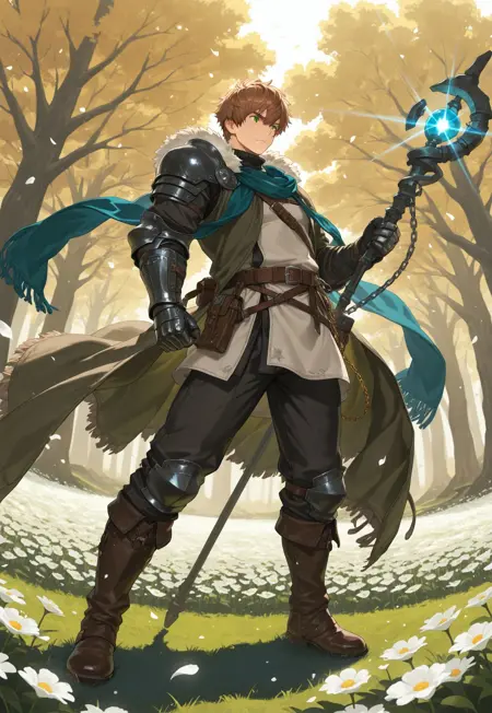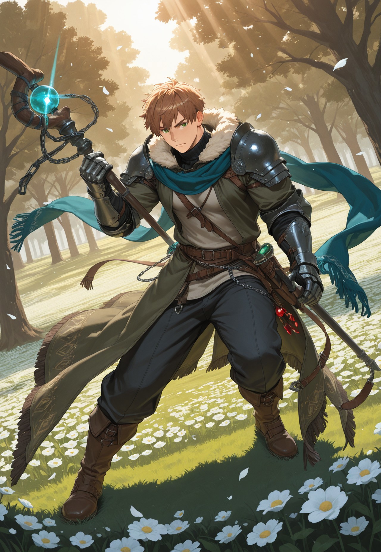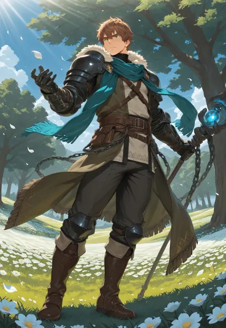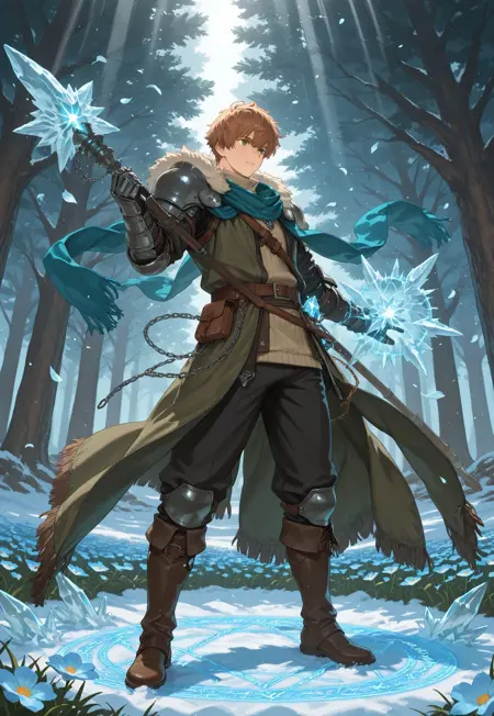 cloak, fur trim, scarf, shirt, turtleneck, staff, handband, shoulder armor, chain, pants, boots, orbs, gauntlets,