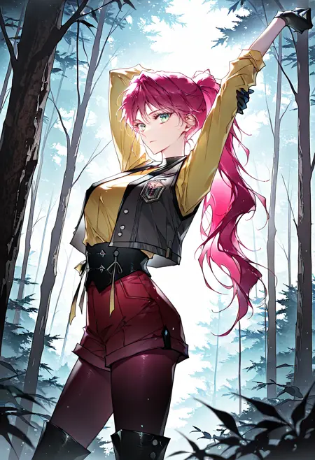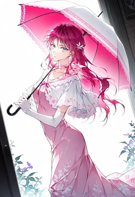 trigger words : Penelope Eckhart, red pink hair, long hair, bangs, green eyes