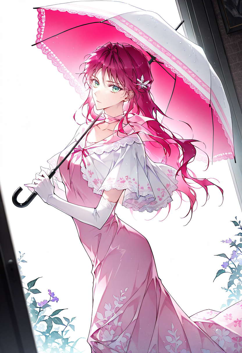 트리거 단어: 페넬로페 에크하트, 빨간 분홍색 머리, 긴 머리, 앞머리, 녹색 눈
