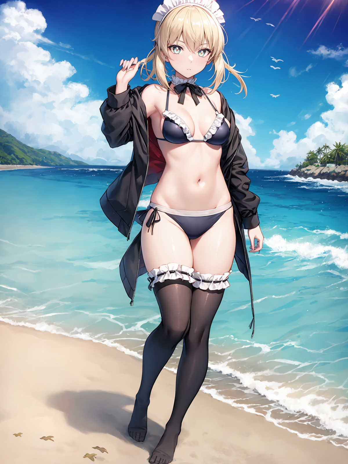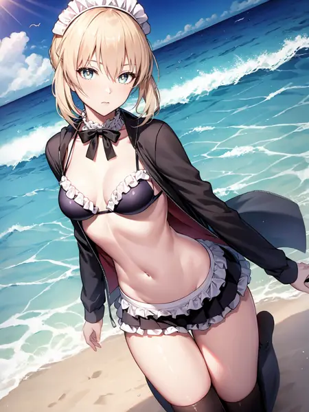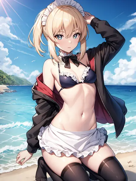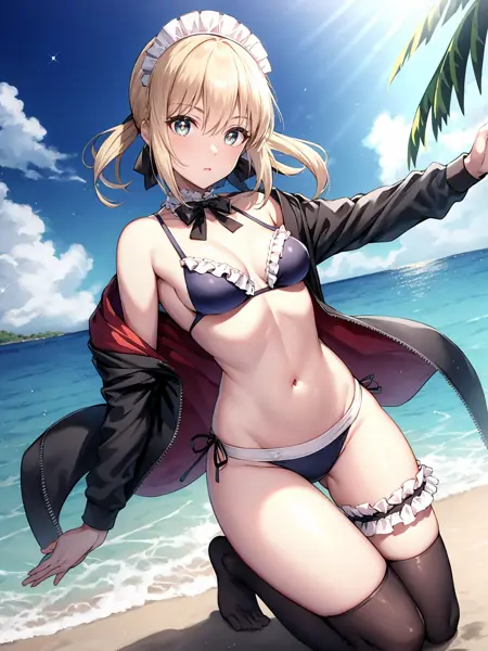 ArtoriaAlter(swimsuit), maid bikini, bikini top only, frills, maid headdress, frilled apron, bridal garter, black thighhighs, choker, black ribbon, black jacket, black skirt,
