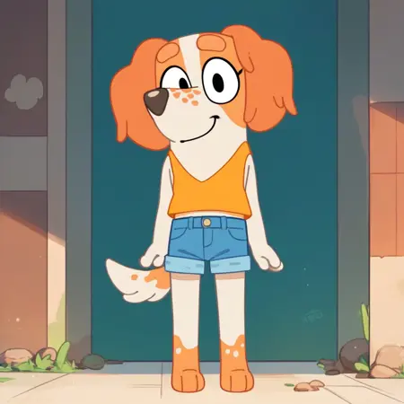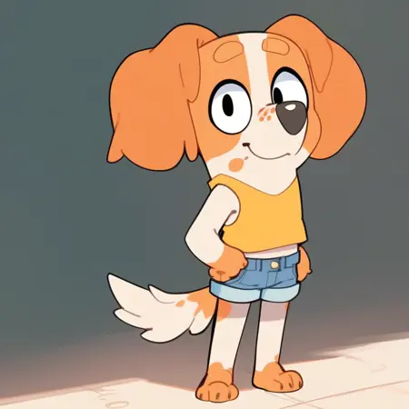 dog girl, English setter, orange and white fur, black eyes, thick eyebrows, black nose, dog ears, dog tail,