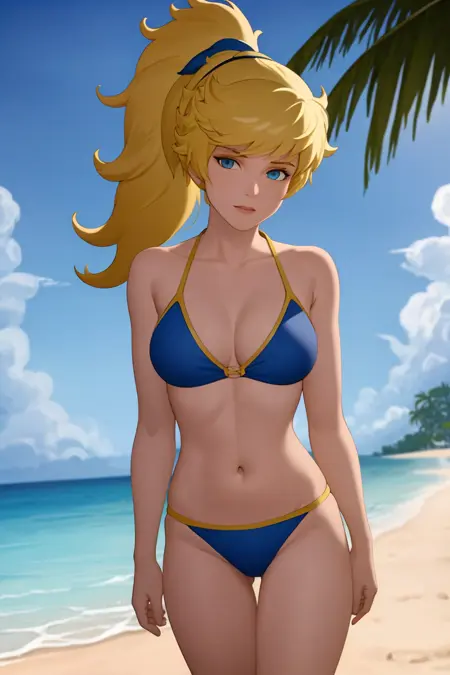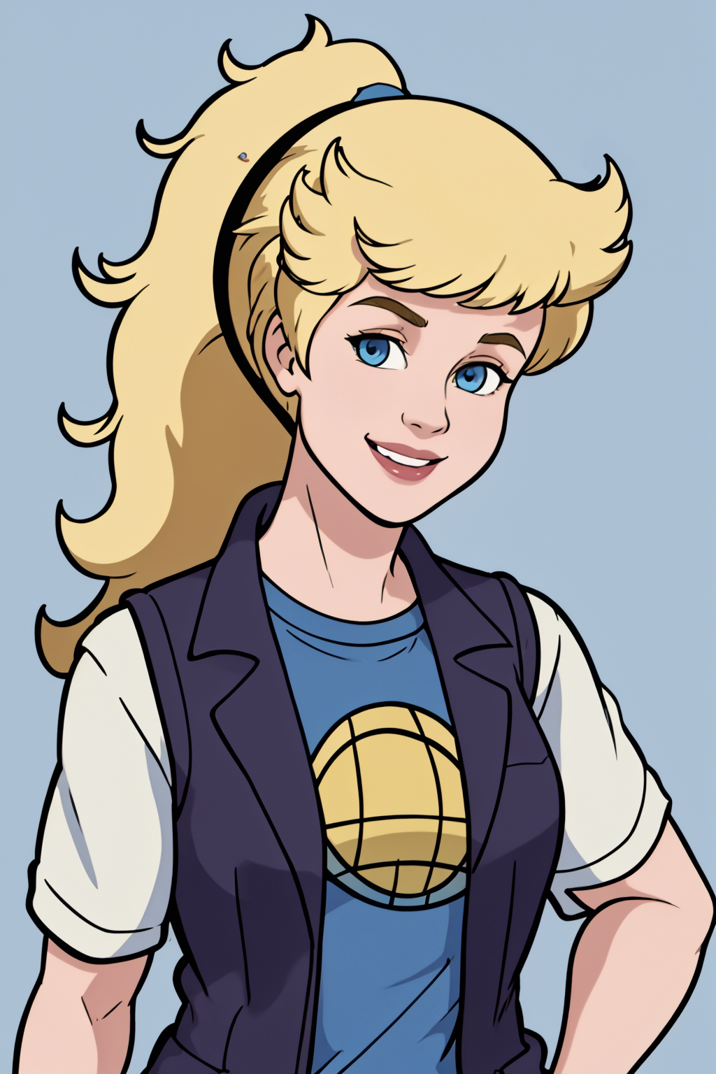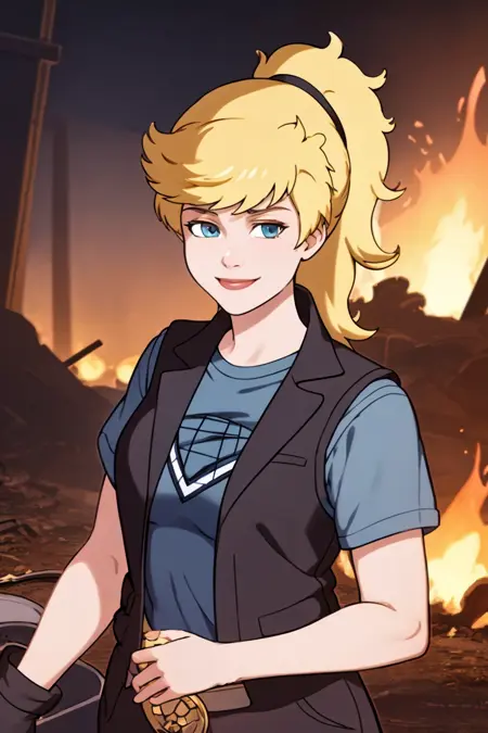 기타 프롬프트: 블론드 헤어, 포니테일, 파란 눈, 조끼, 셔츠, 갈색 반바지, 벨트, 신발, 반지