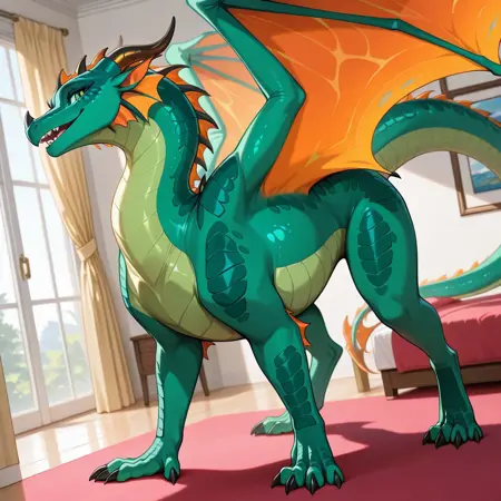 Glory용 프롬프트: Glory_wof, green scales, orange ear frills, orange wings, green eyes, 1girl