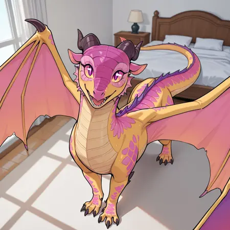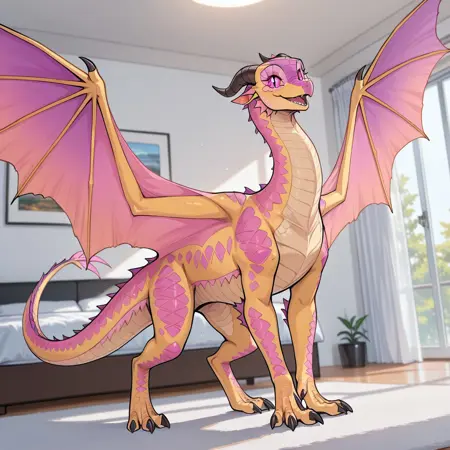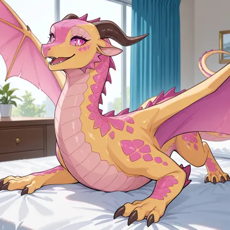 附加提示词:Rainwing_wof、龙、爪子、尾巴、角、粉色鳞片、斑纹鳞片、黄色鳞片、黄色腹部、粉色翅膀、粉色脸、粉色耳缘、粉色眼睛、粉色巩膜、黑色瞳孔