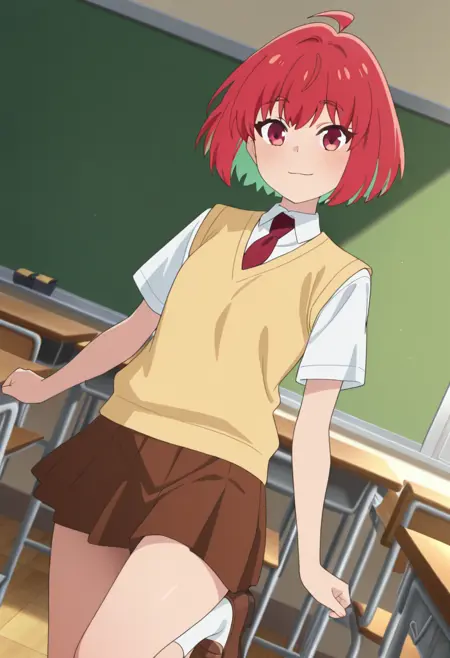 kana_fujii,red hair,short hair,colored inner hair,red eyes,ahoge,school uniform,blazer,brown jacket,long sleeves,red necktie,white shirt,collared shirt,brown skirt,pleated skirt,white socks,shoes,black footwear,loafers,