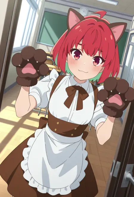 brown dress,puffy sleeves,white shirt,puffy short sleeves,brown bow,waist apron,fake animal ears,cat ears,paw gloves,brown gloves,