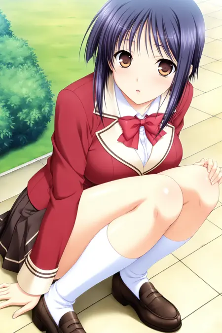 school uniform,long sleeves,shirt,white shirt,bow,blazer,red blazer,red bow,socks,white socks,loafers
