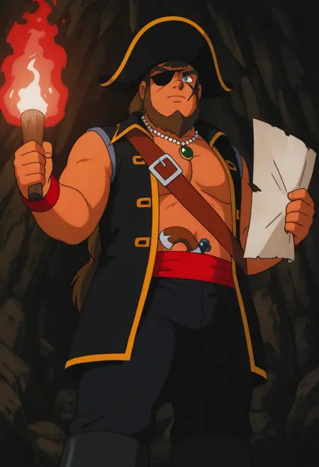 | 训练词汇 | captainkidd, retro artstyle, mature male, muscular, dark skin, brown hair, long hair, ponytail, long sideburns, chinstrap beard, eyepatch, scar on face, blue eyes, thick eyebrows已复制! pirate, pirate hat, bead necklace, green gem pendant, sleeveless, black waistcoat, shoulder strap, yellow trim, open clothes, red sash, red wristband, black pants, black footwear已复制! |