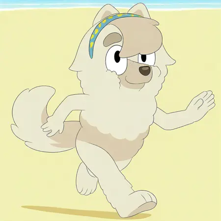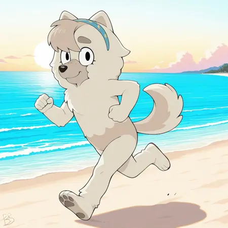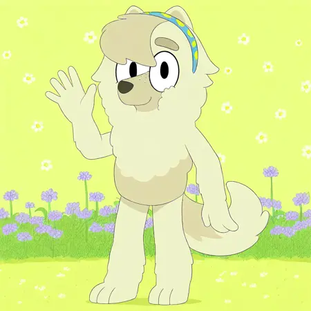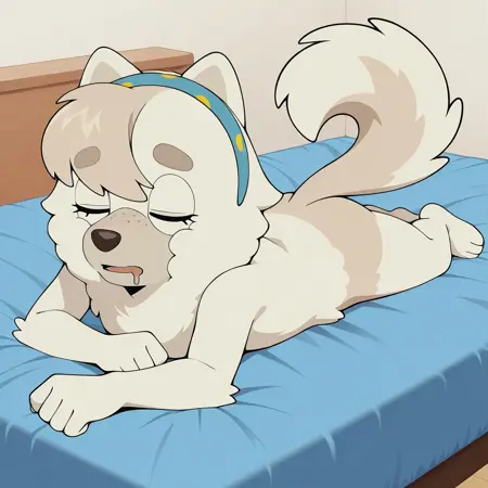 dog girl, chow chow, white and gray fur, fluffy fur, bangs, fluffy tail, black eyes, freckles, blue and yellow hairband,