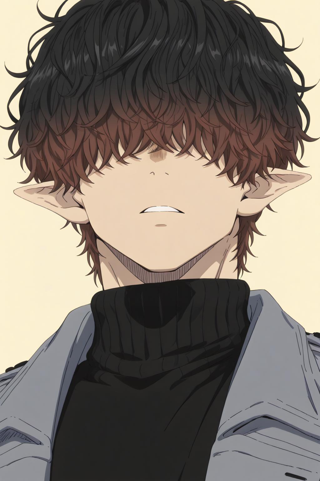 warumono, black hair, bangs, messy hair, gradient hair, brown hair, pointy ears, hair over eyes, facing viewer