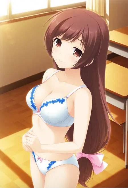asuka_aoba, 1girl, solo, 棕色眼睛, 长发, 极长发, 棕色头发, 发饰蝴蝶结, 蝴蝶结, 粉色蝴蝶结, 中等胸部,