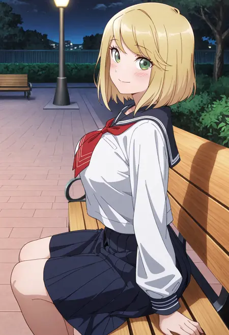 desumi, blonde hair, green eyes, swept bangs, bob cut, large breasts