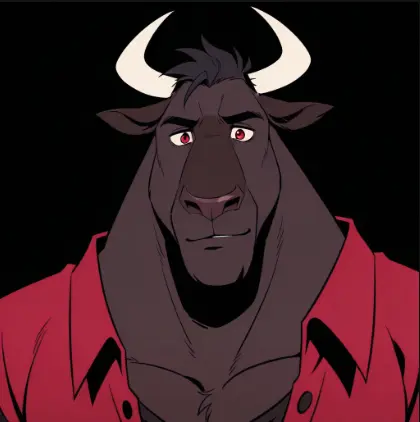 anthro, furry, bull, white horns, dark brown fur, animal ears, red eyes, black hair, bull snout, dark pink nose, dark brown nose bridge, multi-colored fur