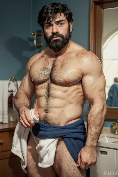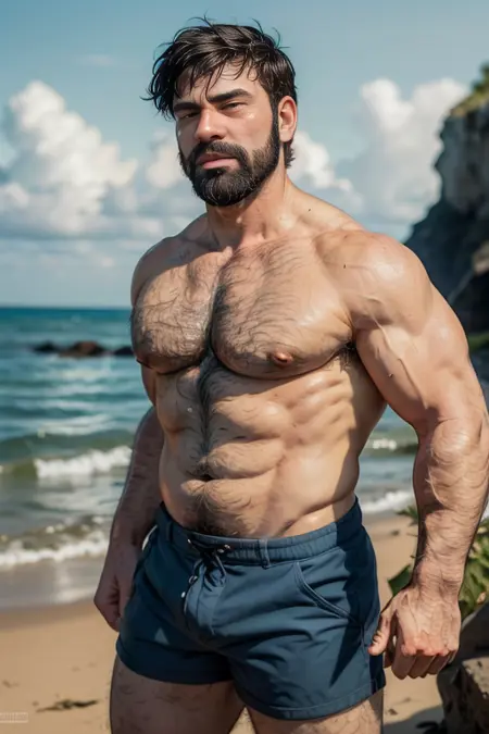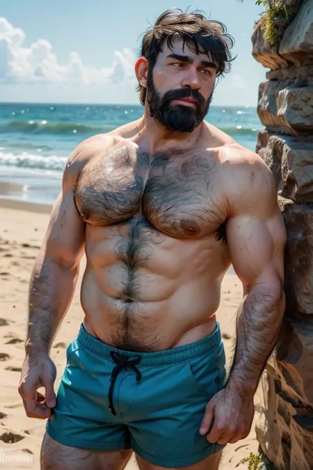 A suggested prompt includes "blue eyes, muscular, hairy".