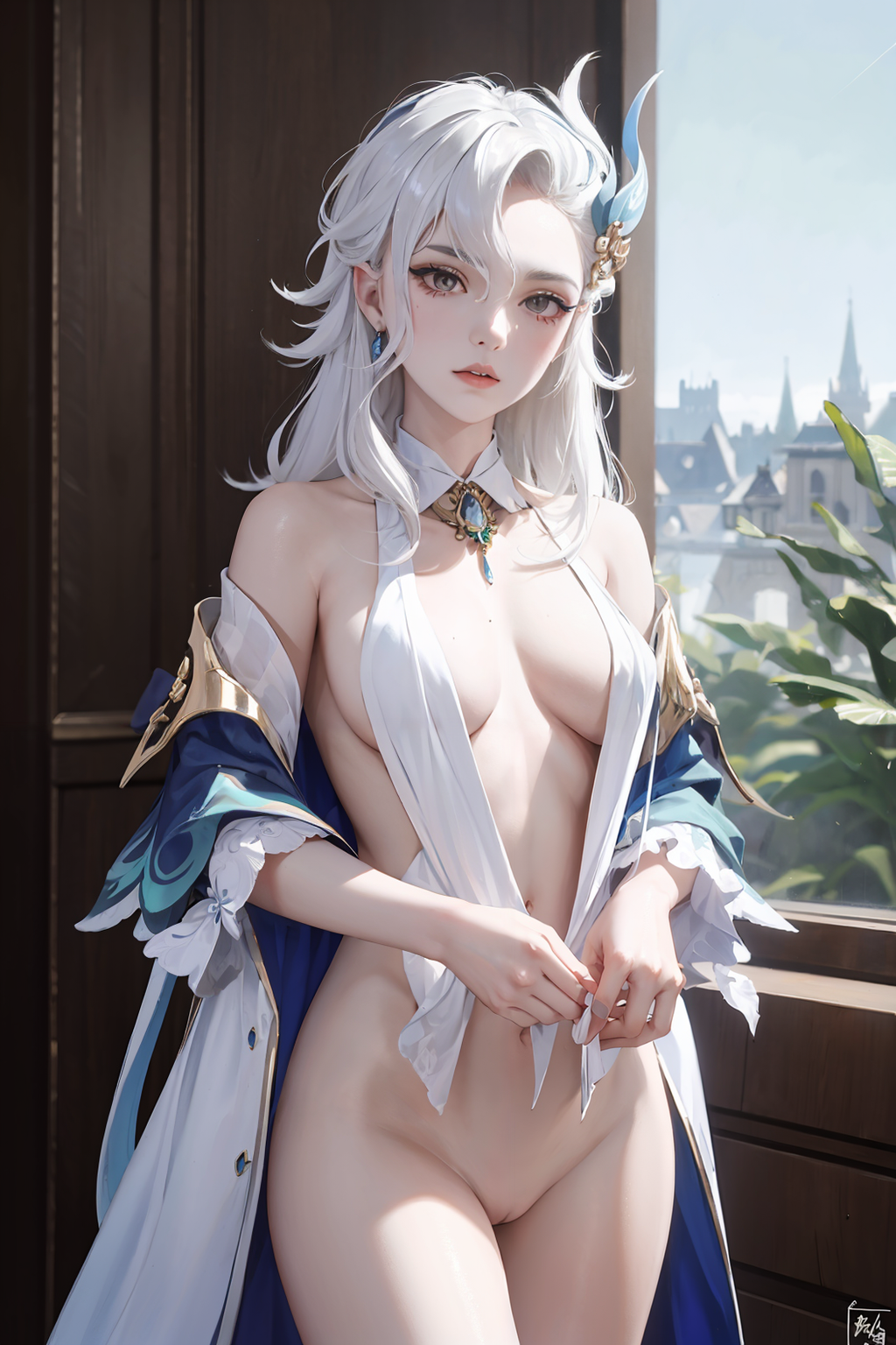 Neuvillette, 1boy,long hair,grey hair,multicolored hair,hair ornament, purple eyes, jewelry,ascot,long sleeves, shirt,gloves, black pants,