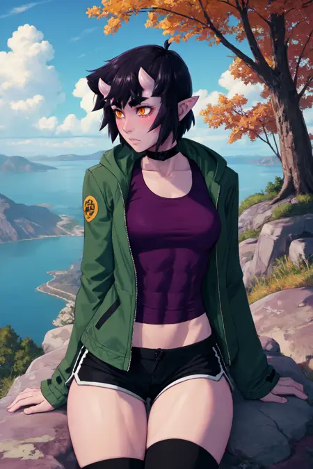 트리거 V3: "UmeIttla, colored skin, orange eyes, slit pupils, oni horns, skin-covered horns, short hair"은 항상 필요하며, 더 정확한 체형을 원하면 "toned"과 "abs"를 추가하세요.