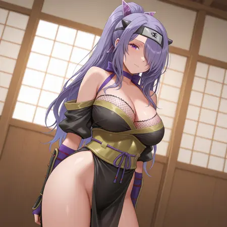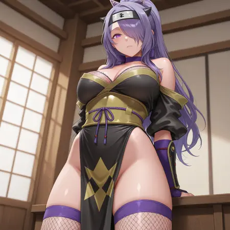 CamillaNinja, Long hair, Purple Hair, Hair over one eye, Ponytail, HeadBand, Hair Ornament, Purple Eyes, Ninja, FishNets, Bare Shoulders, Purple Chocker, Pelvic Curtain, Large Breasts