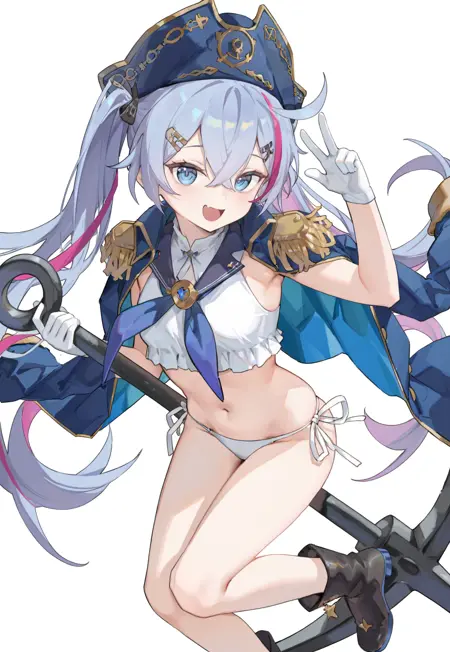 renweb, pirate hat, hairclip, blue coat, coat on shoulders, blue neckerchief, epaulettes, white bikini, crop top, side-tie bikini bottom, white gloves, ankle boots