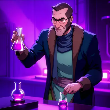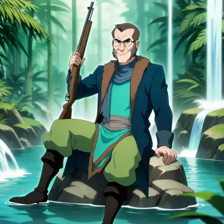 arkrockwell1, 1boy, solo, 成年男性, 深蓝色眼睛, 眼镜, 棕色头发, 带毛领的蓝色外套, 蓝色围巾, 青色束腰外衣, 绿色宽松长裤, 靴子