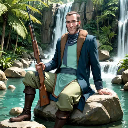 arkrockwell1, solo, 成年男性, 黑色眼睛, 眼镜, 棕色头发, 带毛领的蓝色外套, 蓝色围巾, 青色束腰外衣, 绿色宽松长裤, 靴子