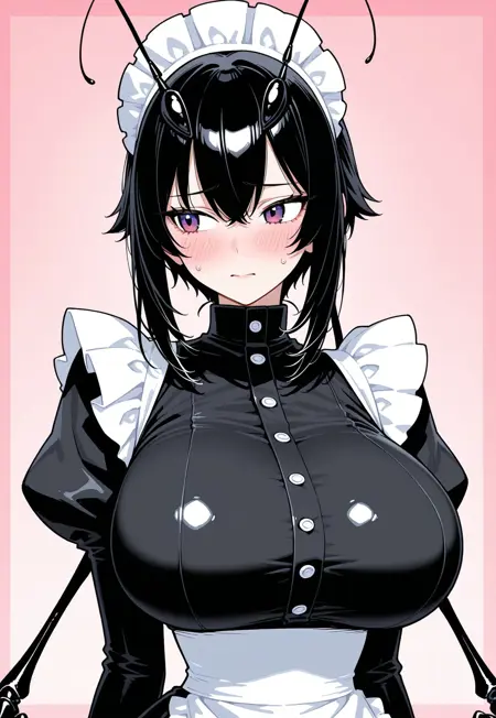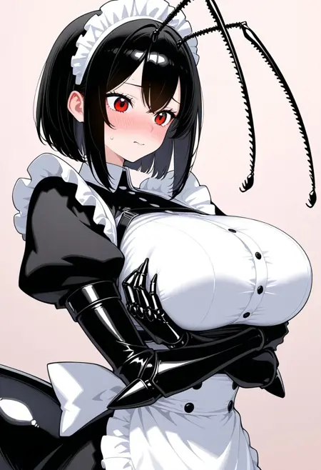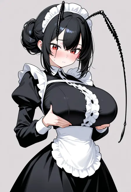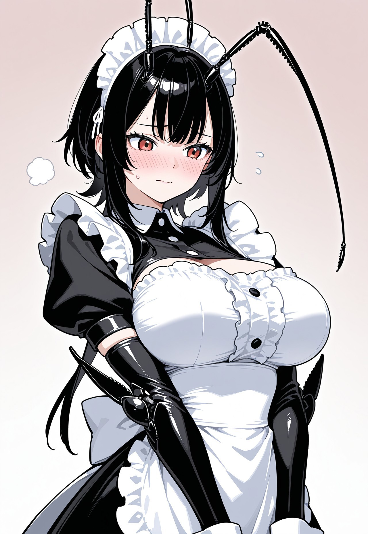 키워드: 트라-chan, 인간형 소녀, 빨간 눈, 검은 머리, 볼베이커 헤어스타일, 사마귀 소녀, 검은 사마귀, 하녀 복장, 수줍음, 귀여움, 얼굴 붉힘